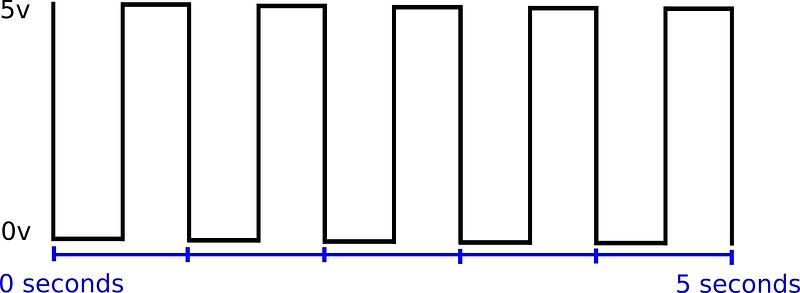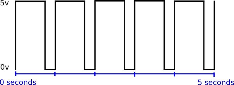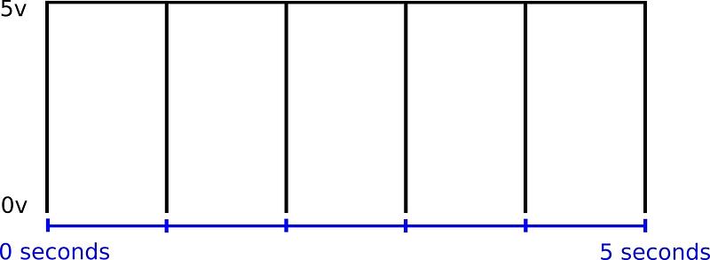 Notice that each HIGH and LOW pulse takes up an entire second each! This means that 1 "cycle" takes exactly 2 seconds - a cycle is one complete HIGH then LOW pulse. In this case, you would only see 1/2 of a cycle per second. The cycle speed is referred to as the "frequency" of the signal, because PWM signals generally maintain a constant frequency throughout their operation. Frequency in digital signals is measured in Hertz or Hz (which is the number of cycles per second) and the above signal would only be 0.5 Hz since it takes 2 seconds to complete 1 cycle. So what would a perfect 1 Hz signal look like?